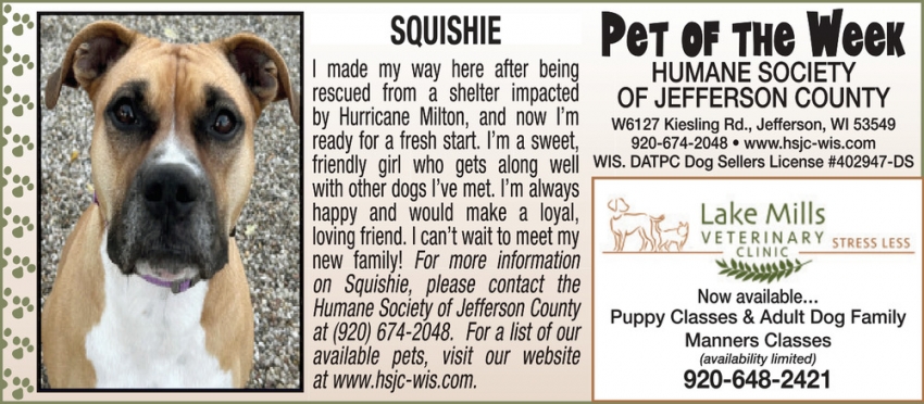 Oct 24, 2024. Lake Mills Veterinary Clinic Pet Ads from Lake Mills Leader