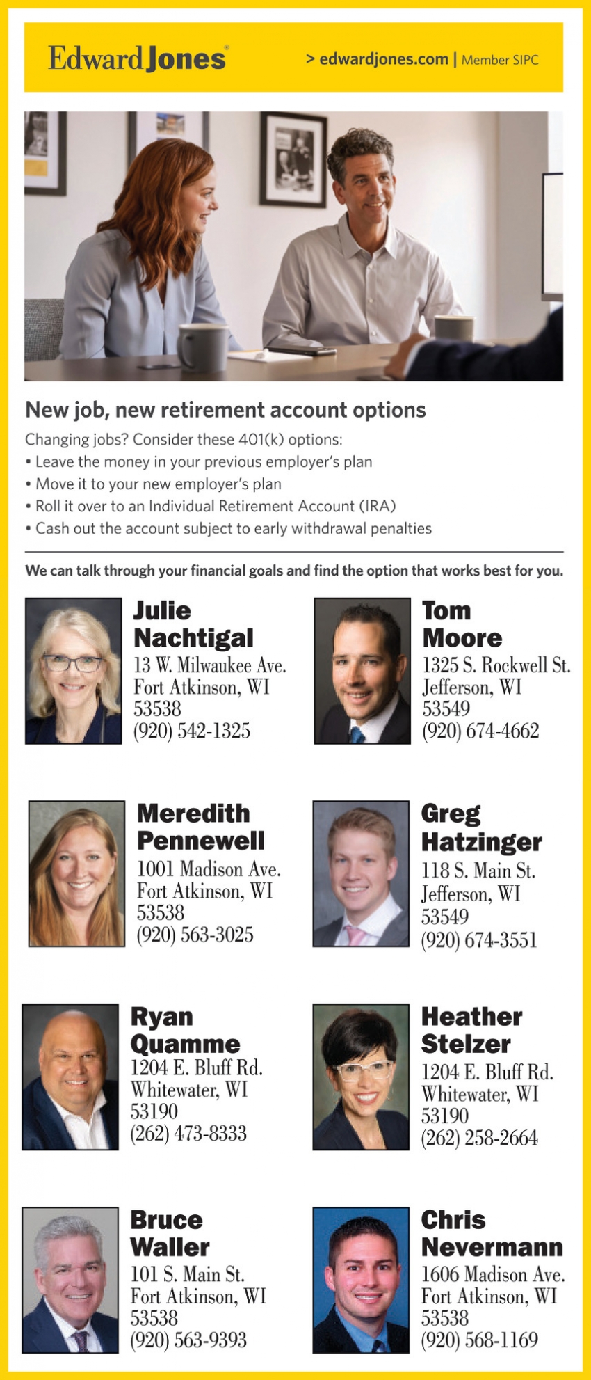Ads for Edward Jones - Julie Nachtigal, Bruce Waller, Meredith Pennewell, Chris Nevermann, Tom Moore in Fort Atkinson, WI