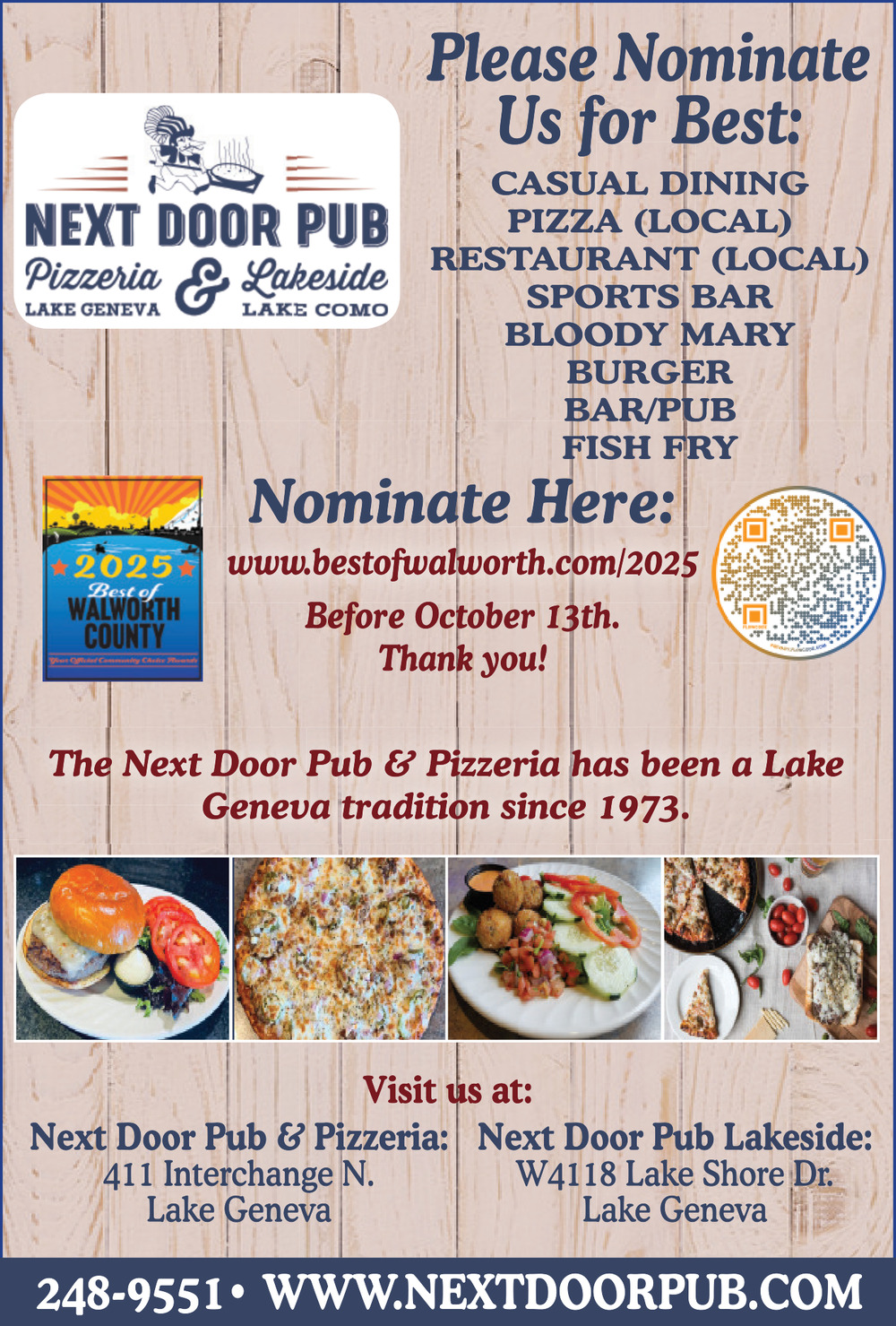 Oct 01, 2025. Next Door Pub & Pizzeria Restaurant Ads from Walworth County SmartShop