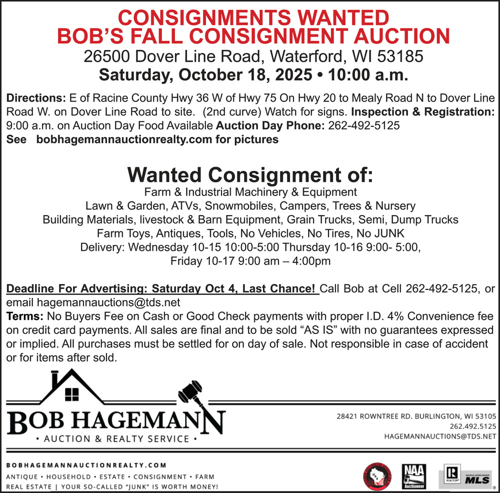 Oct 01, 2025. Bob Hagemann Auction & Realty Service Auction Ads from Walworth County SmartShop