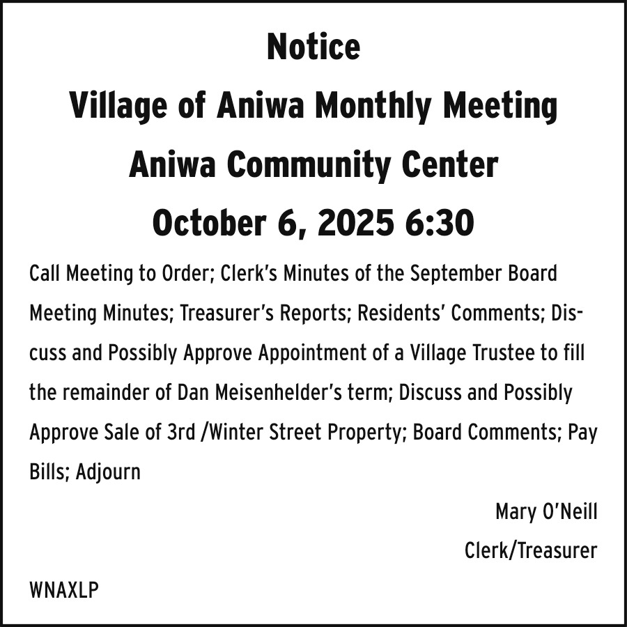 Oct 01, 2025. Village of Aniwa Monthly Meeting at Aniwa Community Center Public Notice Ads from Antigo Daily Journal