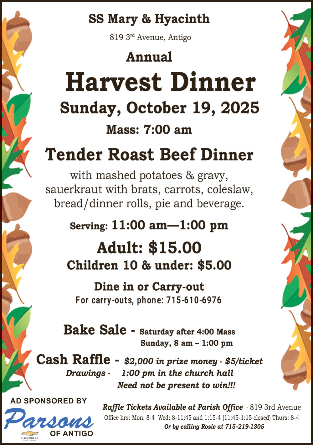 Oct 11, 2025. SS Mary & Hyacinth Annual Harvest Dinner (October 19, 2025) Events Ads from Antigo Daily Journal