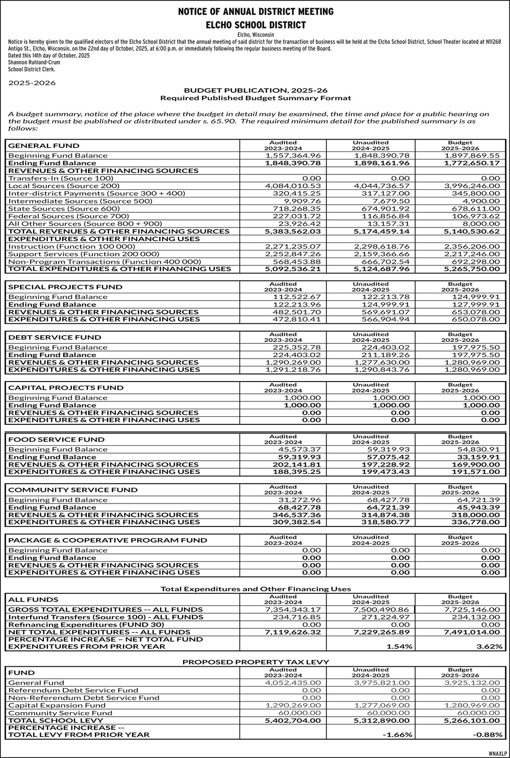 Oct 22, 2025. Elcho School District Public Notice Ads from Antigo Daily Journal