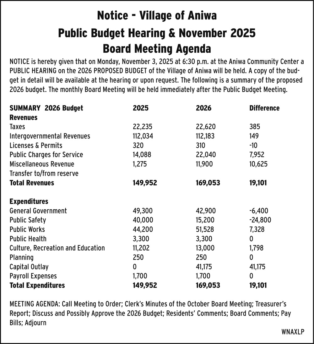 Oct 29, 2025. Village of Aniwa Public Notice Ads from Antigo Daily Journal