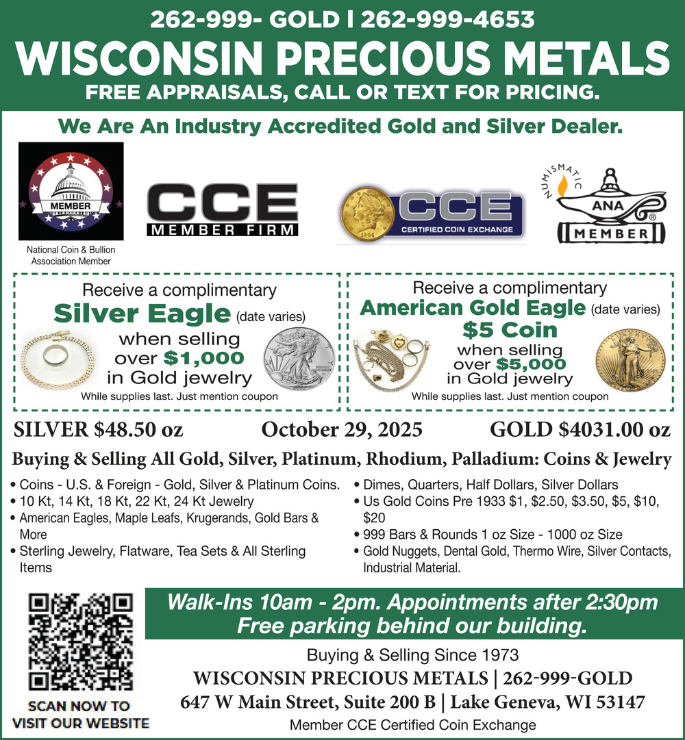 Nov 05, 2025. Wisconsin Precious Metals Refinishing Services Jewelry Ads from Union Extra