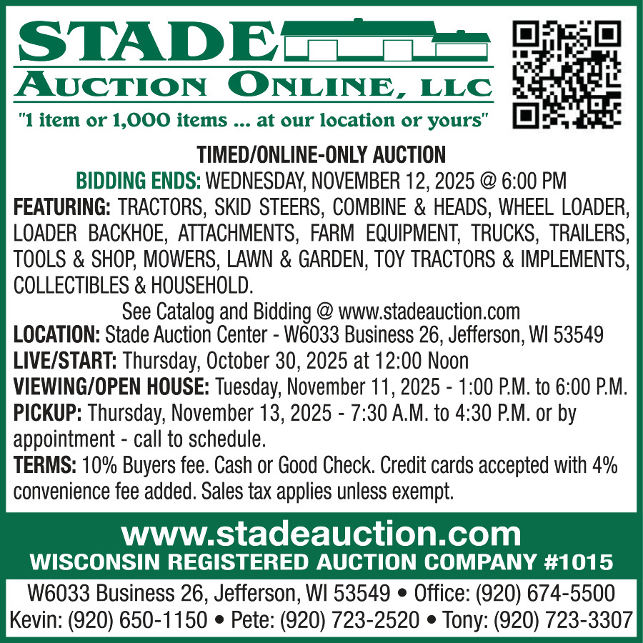 Nov 05, 2025. Stade Auction Online, LLC Auction Ads from Janesville Messenger