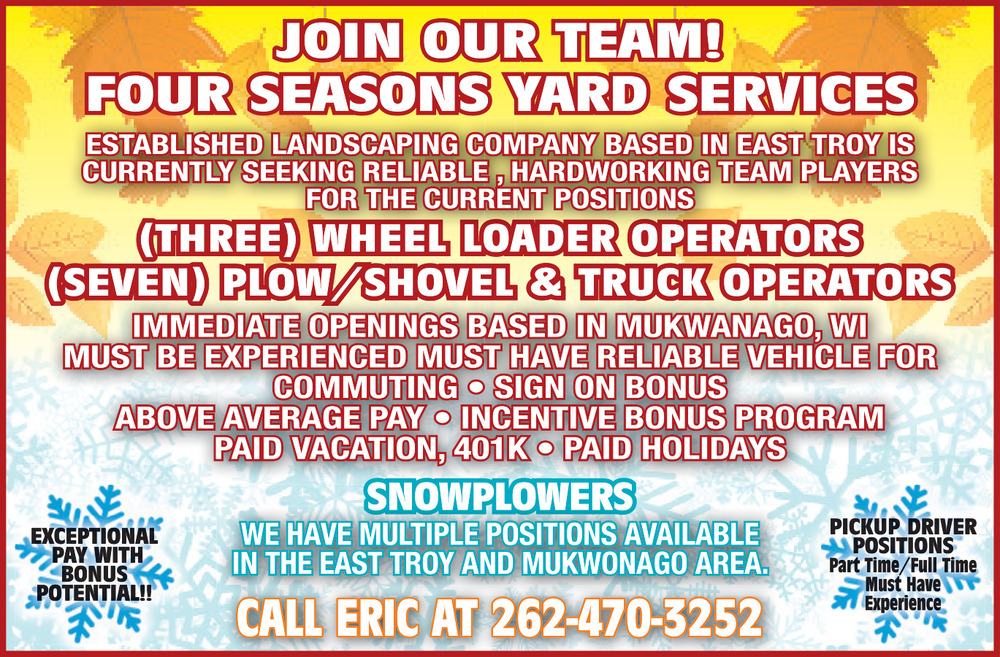 Nov 05, 2025. Four Seasons Yard Services Jobs Ads from Walworth County SmartShop