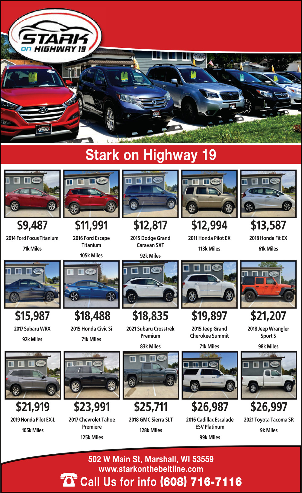608-716-7116502 W Main StMarshall, WI 53559(Stark on Highway 19)