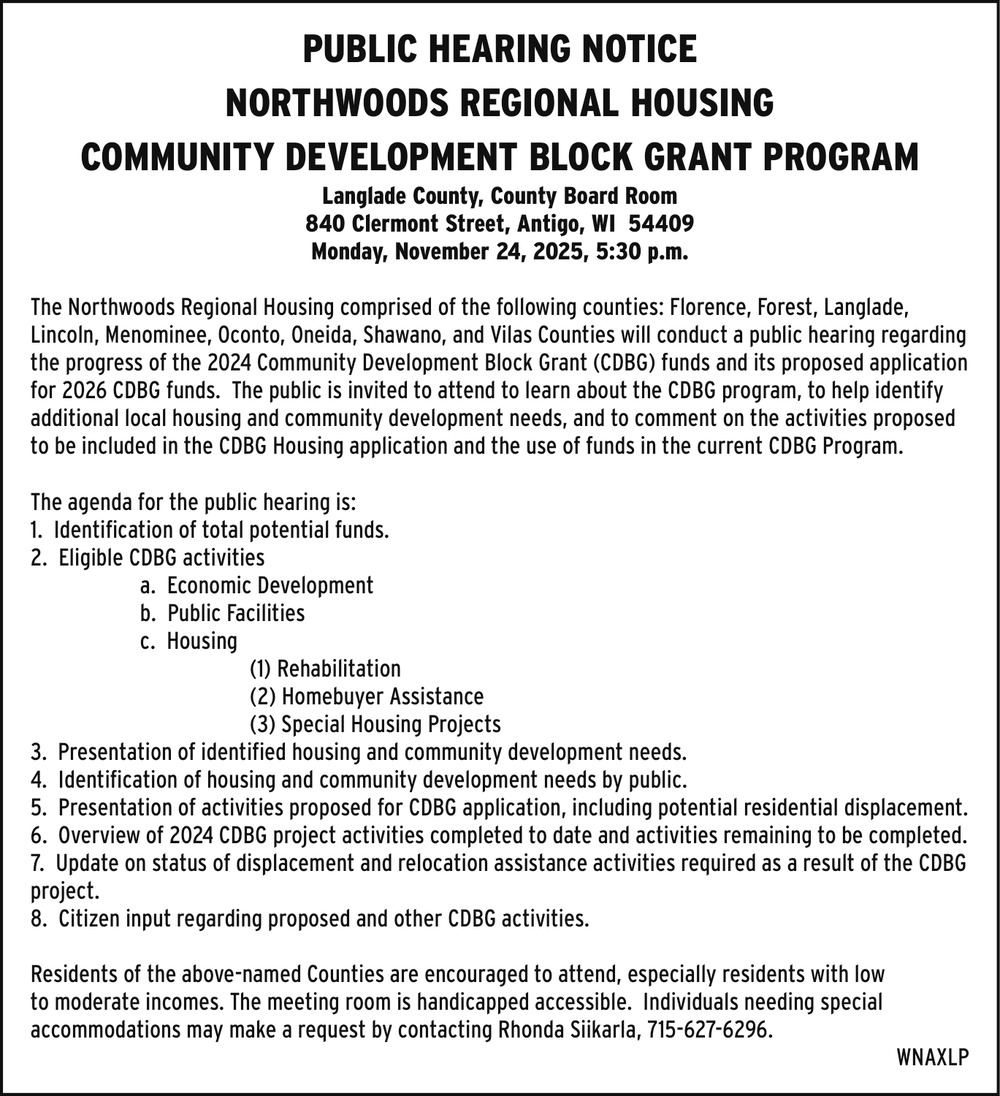 Nov 07, 2025. Northwoods Regional Housing Public Notice Ads from Antigo Daily Journal