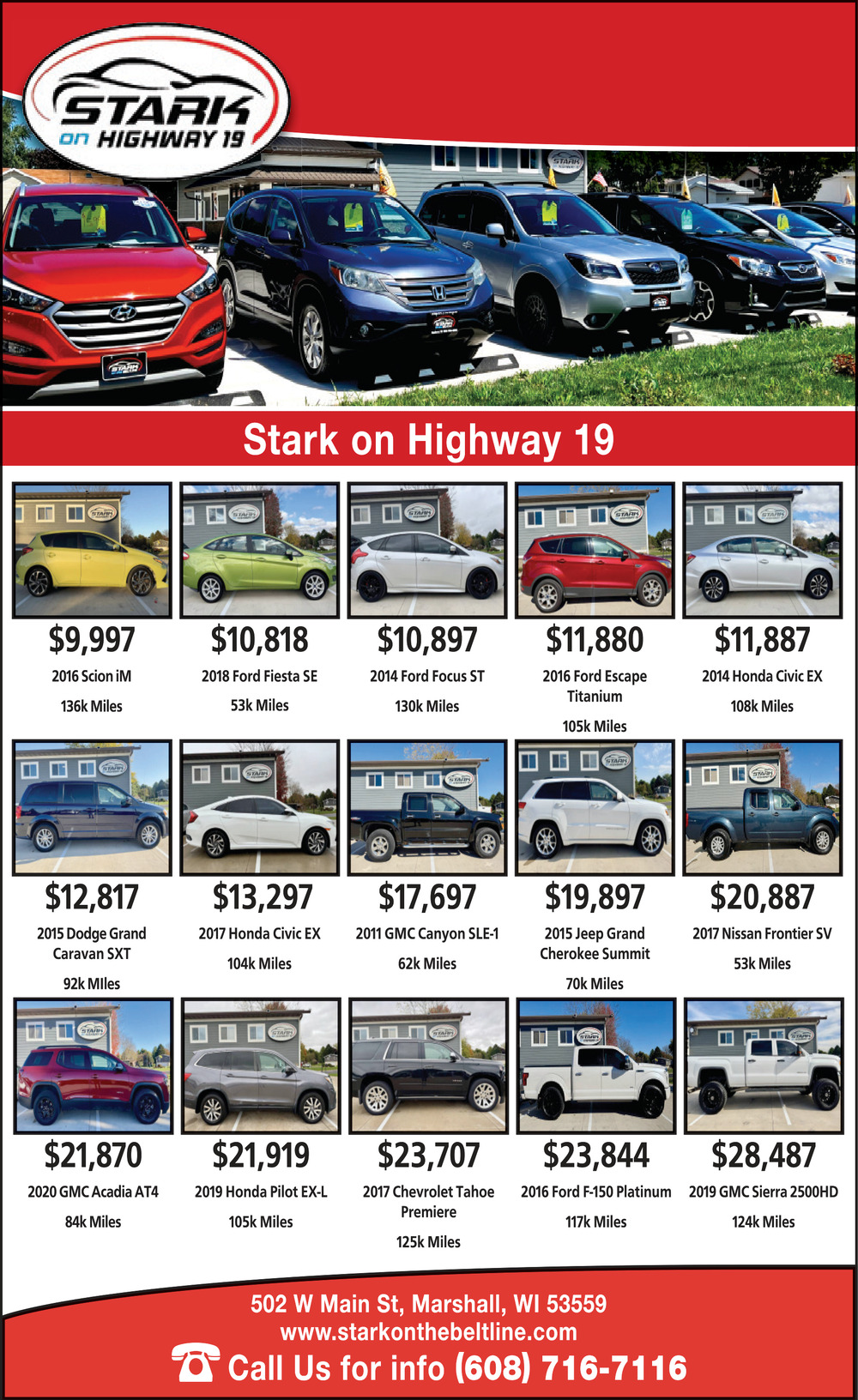 608-716-7116502 W Main StMarshall, WI 53559(Stark on Highway 19)