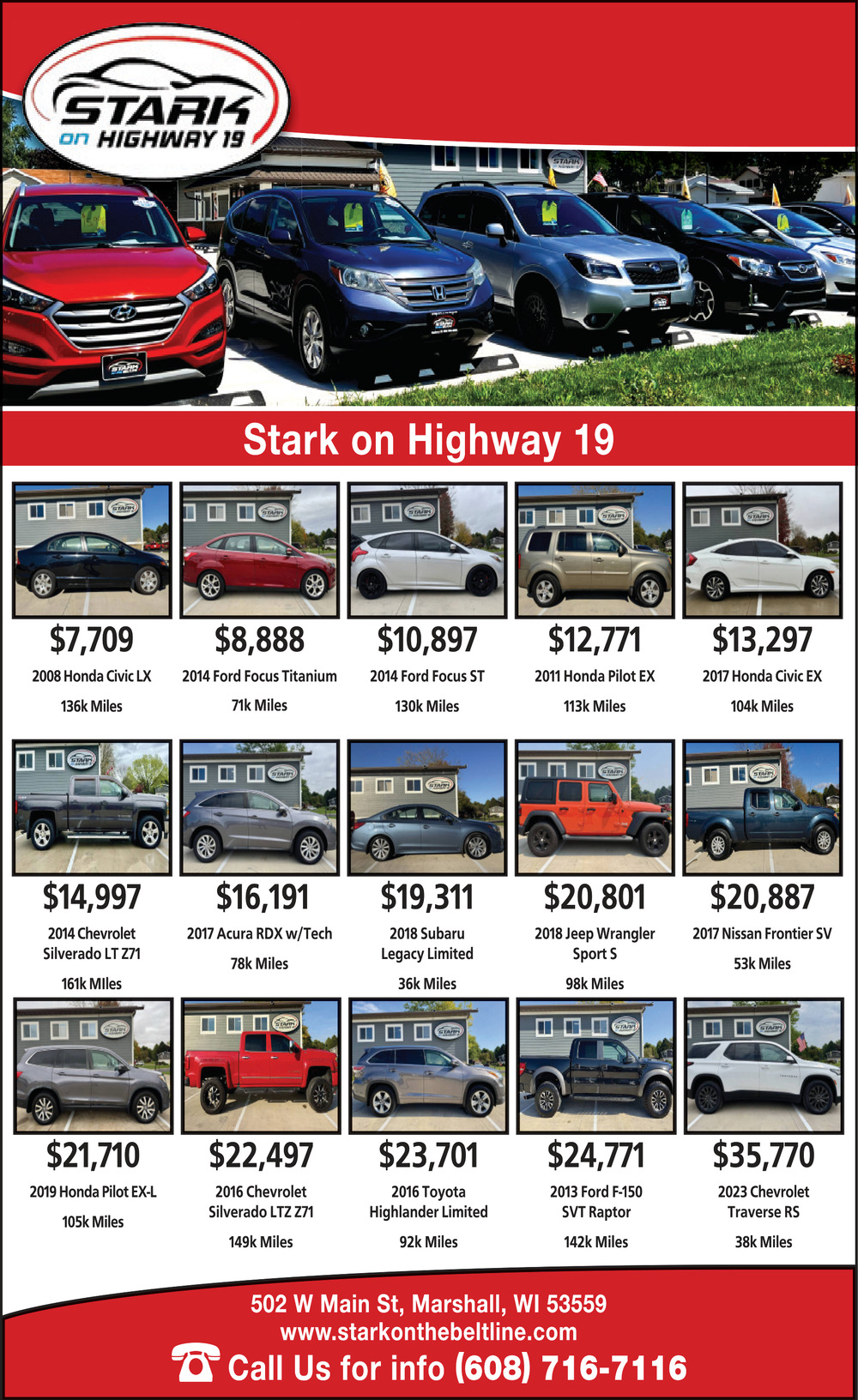 608-716-7116502 W Main StMarshall, WI 53559(Stark on Highway 19)