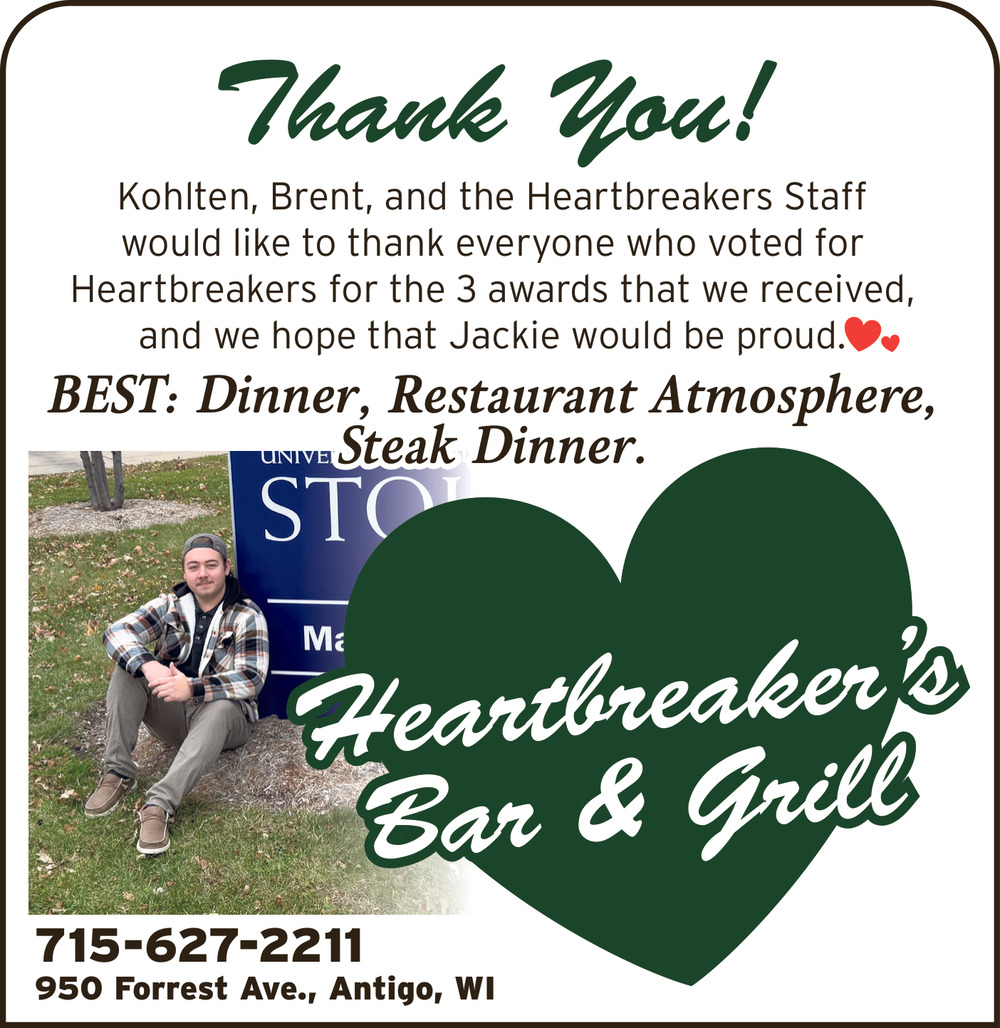 Nov 24, 2025. Heartbreaker's Bar & Grill Restaurant Ads from Antigo Daily Journal