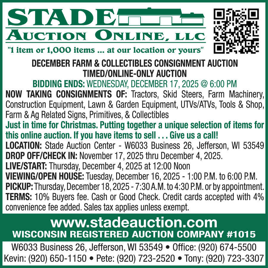 Ads for Stade Auction Online, LLC in Jefferson, WI
