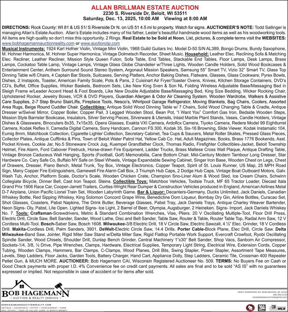 Dec 10, 2025. Bob Hagemann Auction & Realty Service Auction Ads from Janesville Messenger