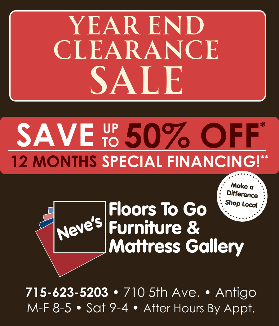 Dec 26, 2025. Neve's Floors to Go Furniture & Mattress Gallery Home Furnishing Ads from Antigo Daily Journal