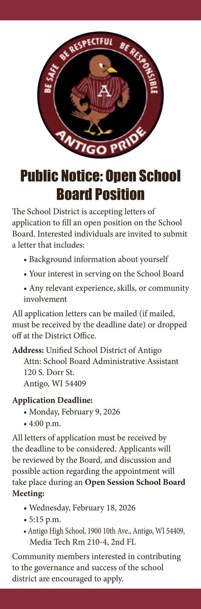 School Board Job Opening in Antigo, WI