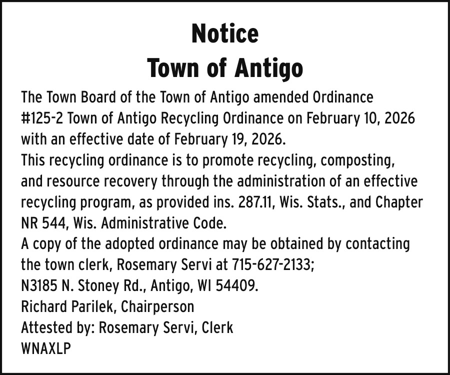 Feb 18, 2026. Town of Antigo Public Notice Ads from Antigo Daily Journal