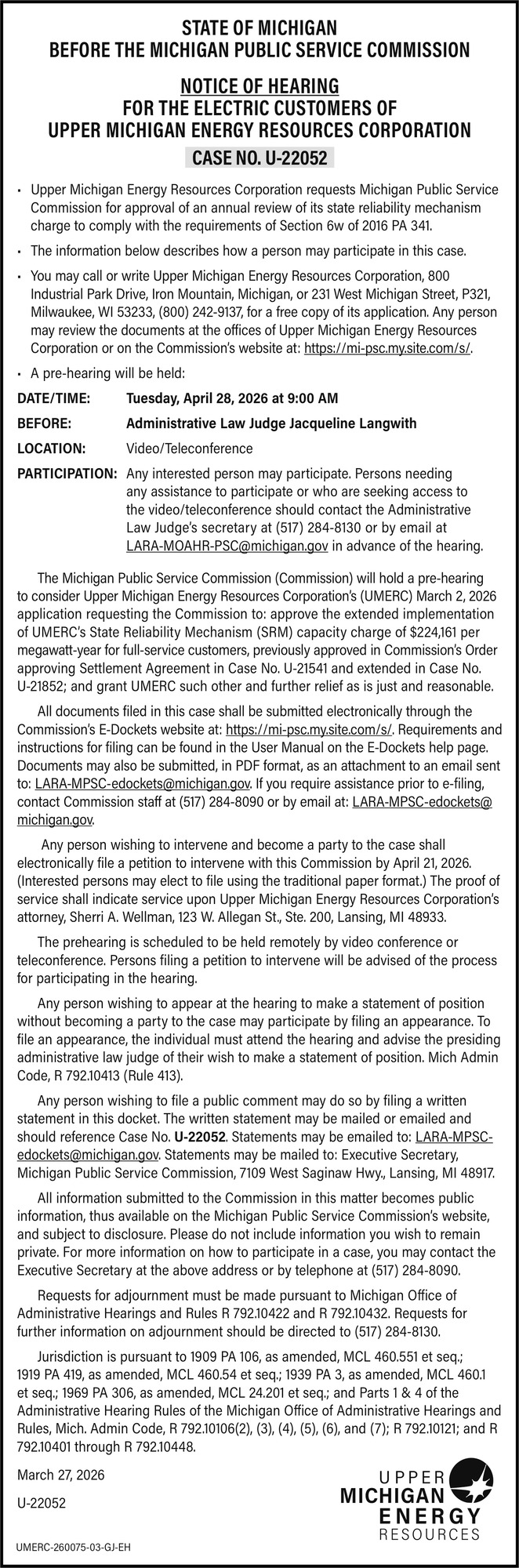Apr 10, 2026. Upper Michigan Energy Resources Public Notice Ads from EagleHerald