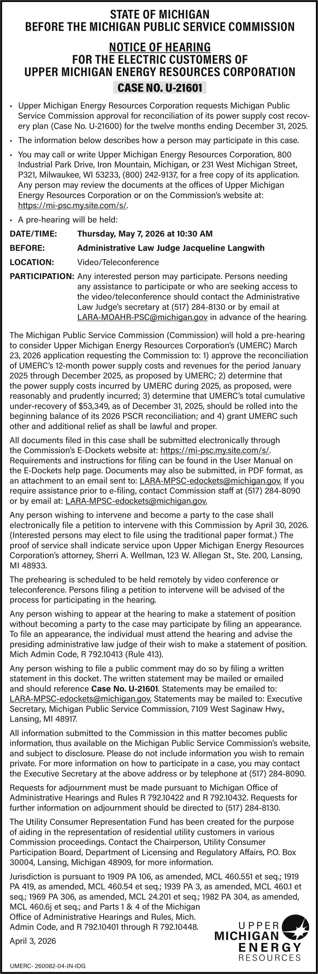 Apr 17, 2026. Upper Michigan Energy Resources Public Notice Ads from EagleHerald