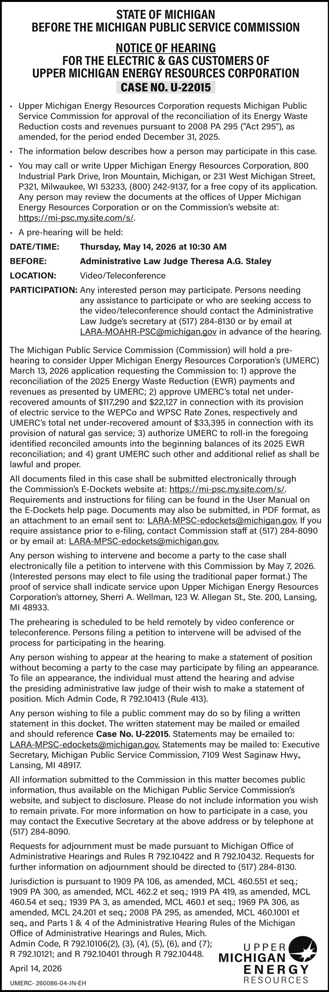 Apr 24, 2026. Upper Michigan Energy Resources Public Notice Ads from EagleHerald