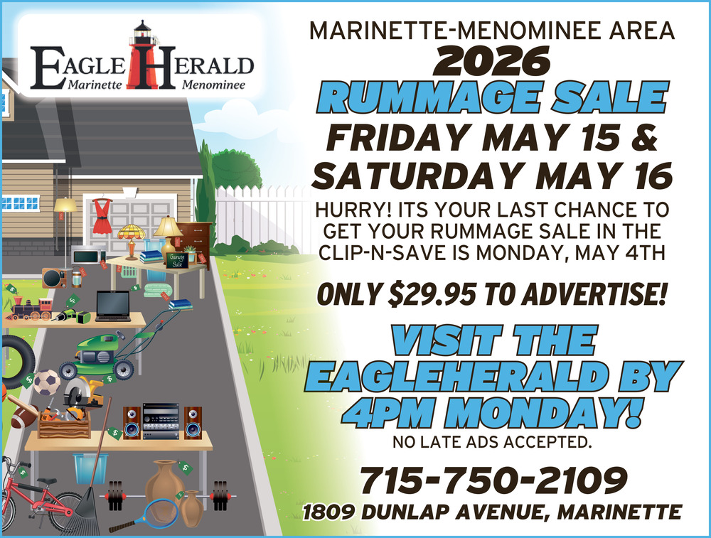 Apr 27, 2026. Marinette-Menominee Area 2026 Rummage Sale (May 15 & 16, 2026) Festivals Ads from EagleHerald